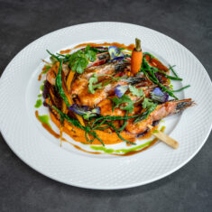 mrkvové pyré, salicornia, kaviár (2, 6, 7)
