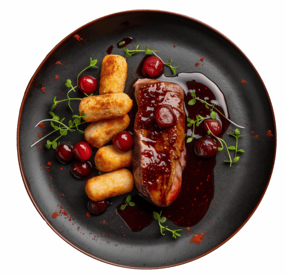 Husí prsa s višňovou omáčkou a bramborovými kroketami – 545 Kč