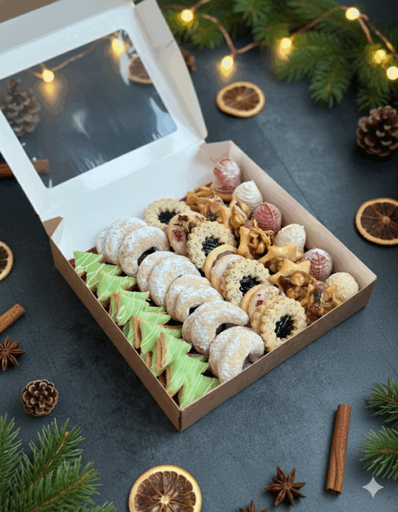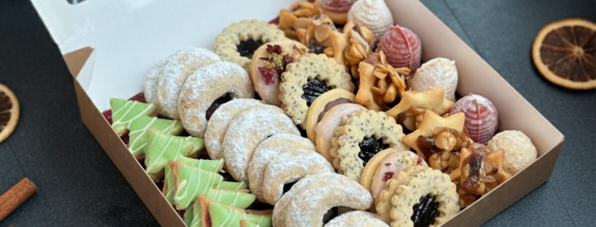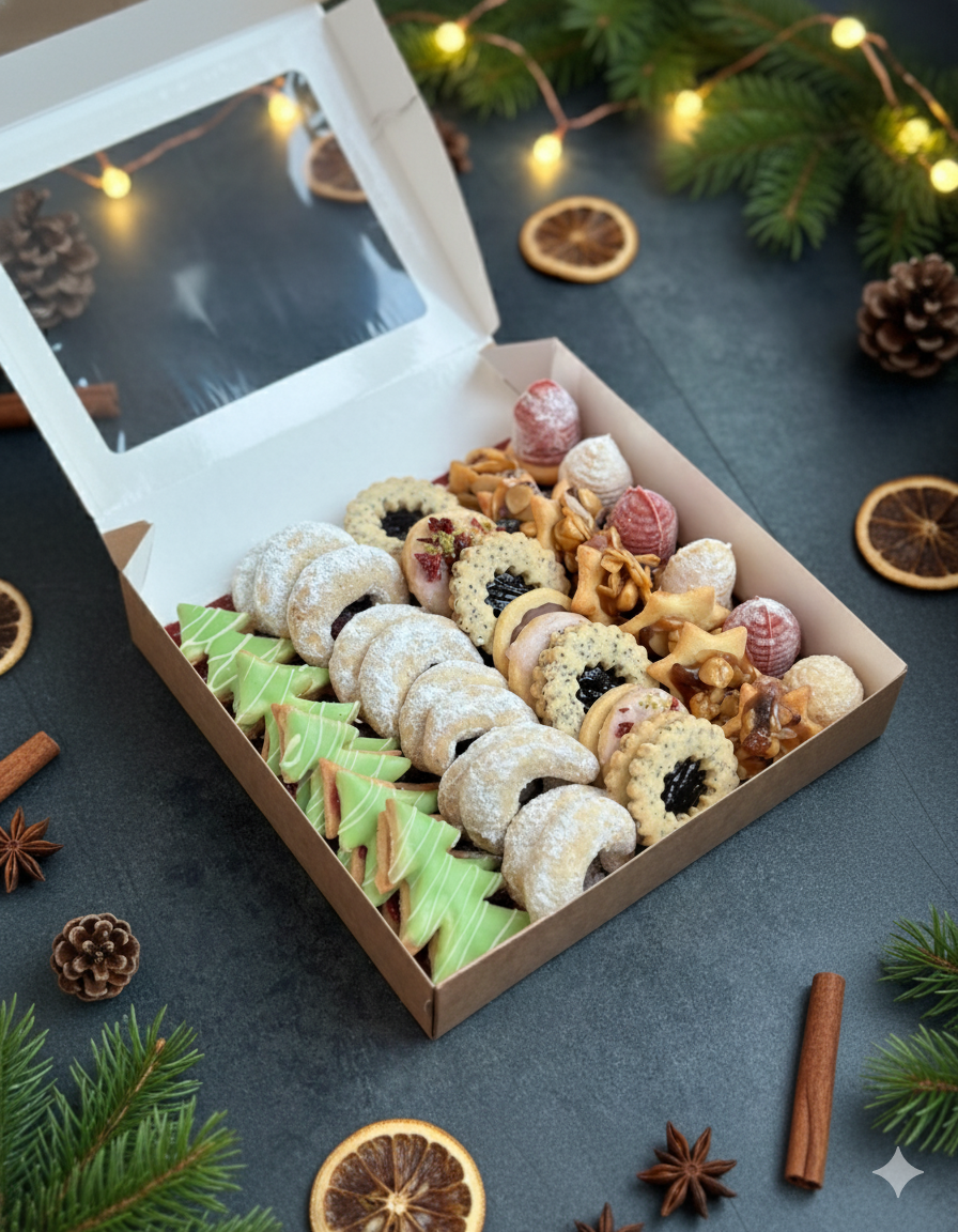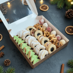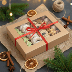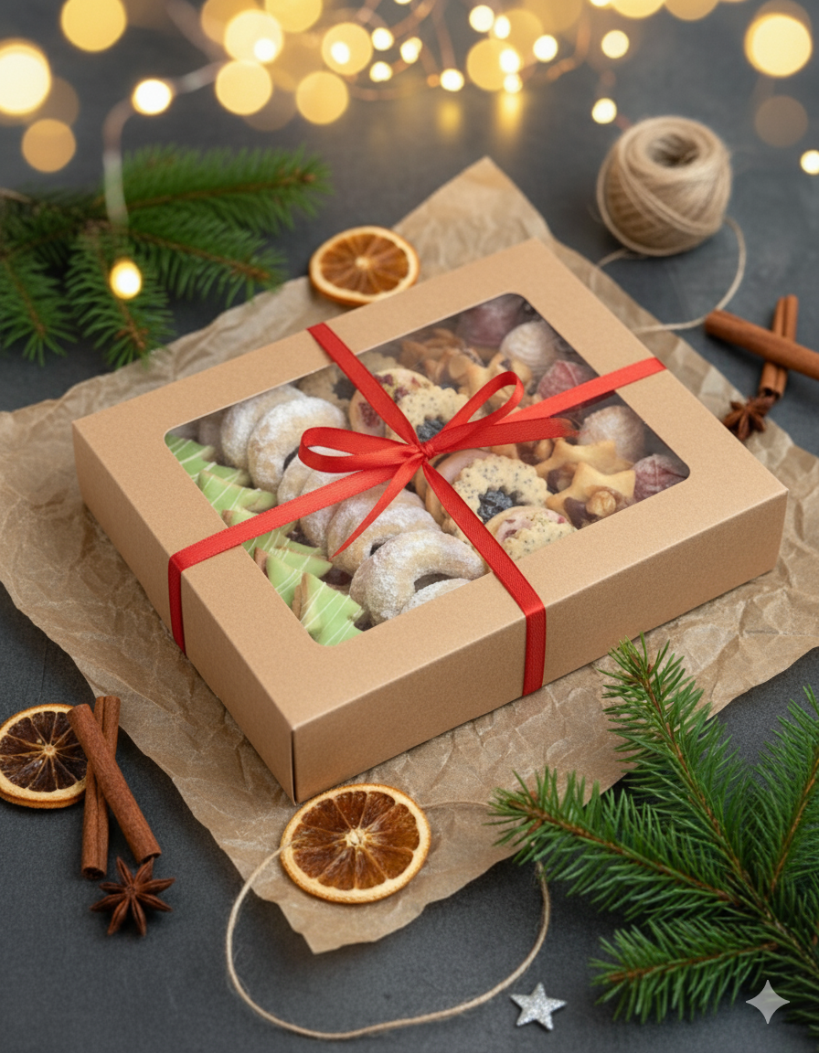 Cukroví obdržíte v krásném dárkovém balení, ve kterém najdete celkem šest druhů cukroví.