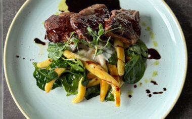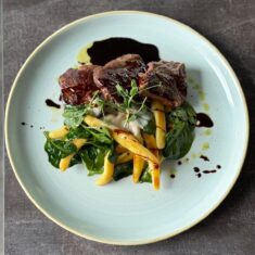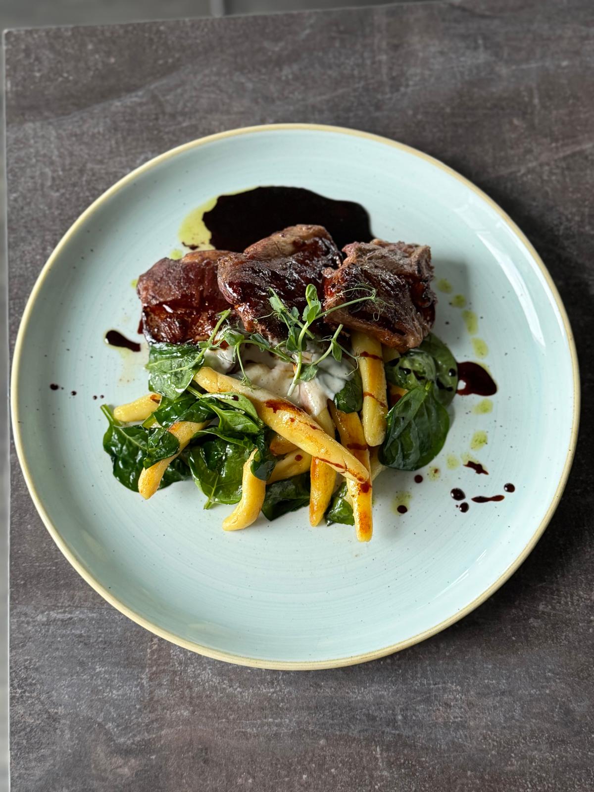 vinná redukce a restované noky s baby špenátem (1, 3, 7, 9, 12)