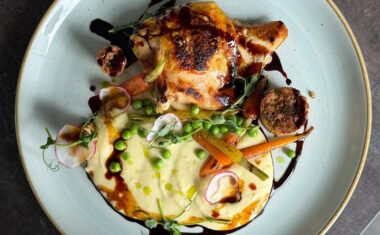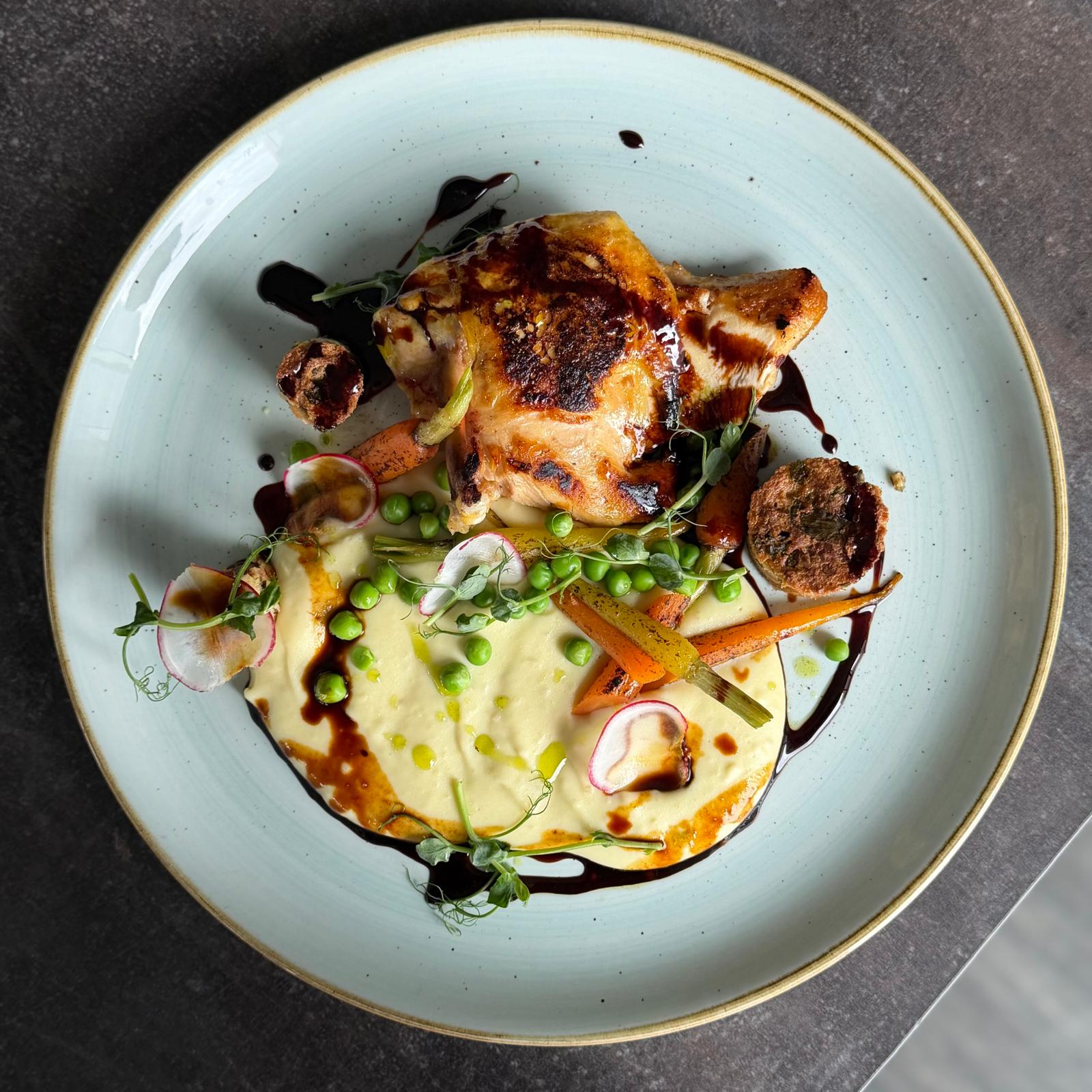 bramborové pyré, nádivka, jarní zelenina a jus z pečeného kuřete (1, 3, 7)